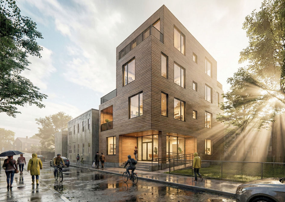 This project is a modern multi-family residential building designed to fit within an urban neighborhood context. It features clean geometric forms, large windows, and a mix of neutral cladding with warm wood accents to create a contemporary yet welcoming appearance.
